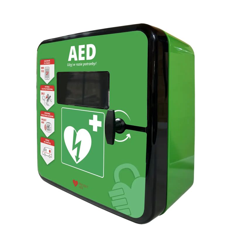 - Odporne na stłuczenie okienko inspekcyjne. Umożliwia podgląd statusu AED bez utraty wytrzymałości
